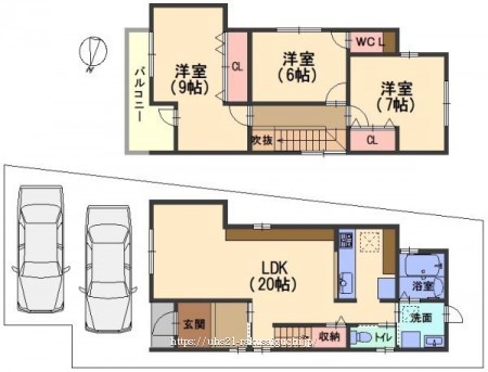 階数 区分 広さ 1F LDK 20.0帖 2F 洋 9.0帖 2F 洋 7.0帖 2F 洋 6.0帖 - 駐車場
