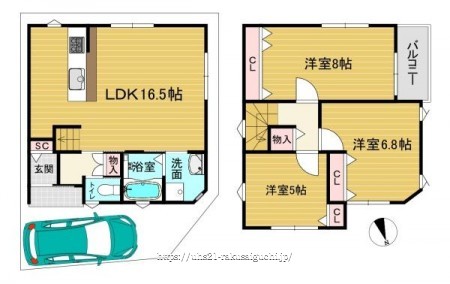 階数 区分 広さ 1F LDK 16.5帖 2F 洋 8.0帖 2F 洋 6.8帖 2F 洋 5.0帖 - 駐車場