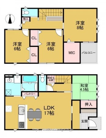 階数 区分 広さ 1F LDK 17.0帖 1F 和 4.5帖 2F 洋 8.0帖 2F 洋 6.0帖 2F 洋 6.0帖 - 駐車場