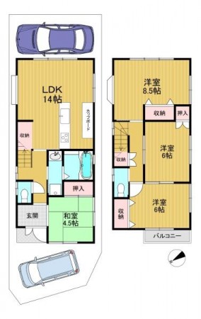 階数 区分 広さ 1F LDK 14.0帖 1F 和 4.5帖 2F 洋 8.5帖 2F 洋 6.0帖 2F 洋 6.0帖 - 駐車場