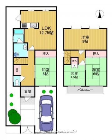階数 区分 広さ 1F LDK 12.8帖 1F 和 6.0帖 2F 洋 9.0帖 2F 和 6.0帖 2F 和 4.5帖 - 駐車場