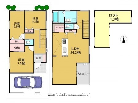 延床面積:121.07平米(1F:64.26平米、2F:56.81平米)