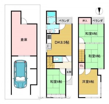 階数 区分 広さ 2F DK 8.5帖 2F 和 6.0帖 3F 和 6.0帖 3F 和 6.0帖 3F 洋 6.0帖 - 駐車場