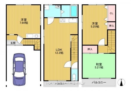階数 区分 広さ 1F 洋 7.6帖 2F LDK 12.3帖 3F 洋 5.3帖 3F 和 5.2帖 - 駐車場