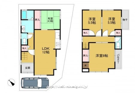 階数 区分 広さ 1F LDK 12.0帖 1F 和 4.5帖 2F 洋 8.0帖 2F 洋 5.5帖 2F 洋 5.5帖 - 駐車場