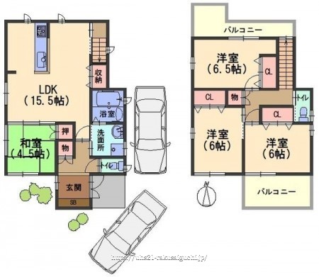 階数 区分 広さ 1F LDK 15.5帖 1F 和 4.5帖 2F 洋 6.5帖 2F 洋 6.0帖 2F 洋 6.0帖 - 駐車場