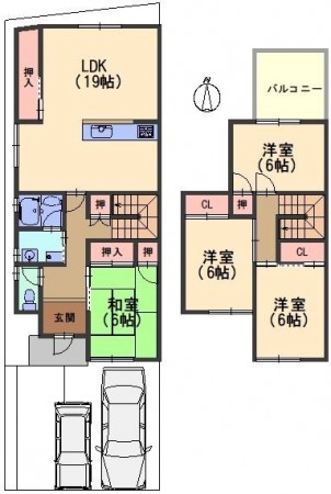 階数 区分 広さ 1F LDK 19.0帖 1F 和 6.0帖 2F 洋 6.0帖 2F 洋 6.0帖 2F 洋 6.0帖 - 駐車場