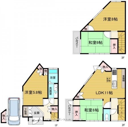 階数 区分 広さ 1F 洋 5.8帖 2F LDK 11.0帖 2F 和 6.0帖 3F 洋 8.0帖 3F 洋 6.0帖 - 駐車場