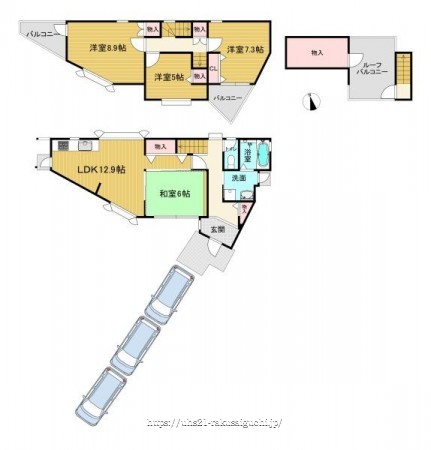 階数 区分 広さ 1F LDK 12.9帖 1F 和 6.0帖 2F 洋 8.9帖 2F 洋 7.3帖 2F 洋 5.0帖 - 駐車場