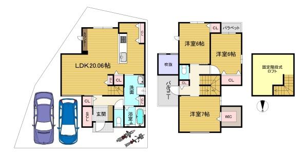階数 区分 広さ 1F LDK 20.1帖 2F 洋 7.0帖 2F 洋 6.0帖 2F 洋 6.0帖 - 駐車場