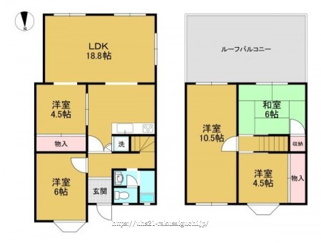 階数 区分 広さ 1F LDK 18.8帖 1F 洋 6.0帖 2F 洋 4.5帖 2F 洋 10.5帖 2F 洋 4.5帖 2F 和 6.0帖 - 駐車場