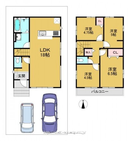 階数 区分 広さ 1F LDK 18.0帖 2F 洋 6.5帖 2F 洋 5.0帖 2F 洋 4.8帖 2F 洋 4.5帖 - 駐車場