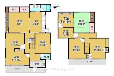 階数 区分 広さ 1F DK 6.0帖 1F 洋 8.0帖 1F 洋 7.5帖 1F 洋 6.2帖 1F 洋 6.0帖 2F 和 6.0帖 2F 洋 6.0帖 2F 洋 6.0帖 2F 洋 4.5帖 2F 洋 3.0帖 - 駐車場