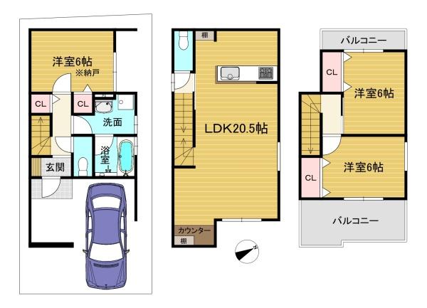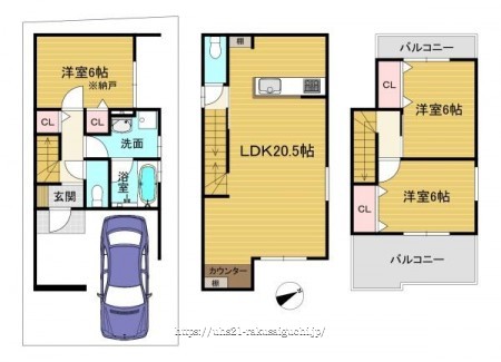 階数 区分 広さ 1F S 6.0帖 2F LDK 20.4帖 3F 洋 6.0帖 3F 洋 6.0帖 - 駐車場