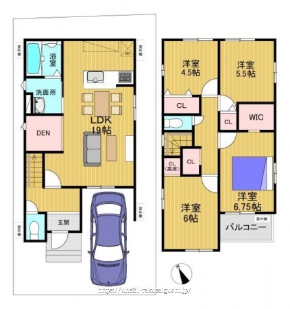 階数 区分 広さ 1F LDK 19.0帖 2F 洋 4.5帖 2F 洋 5.5帖 2F 洋 6.0帖 2F 洋 6.8帖 - 駐車場