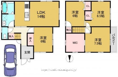 階数 区分 広さ 1F LDK 14.0帖 1F 洋 6.0帖 2F 洋 7.5帖 2F 洋 6.5帖 2F 洋 6.0帖 - 駐車場