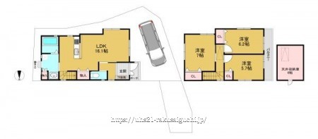 階数 区分 広さ 1F LDK 16.1帖 2F 洋 7.0帖 2F 洋 6.2帖 2F 洋 5.7帖 - 駐車場