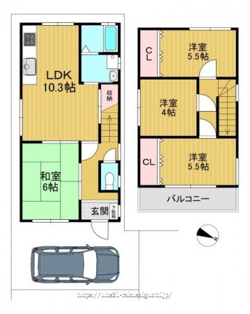 階数 区分 広さ 1F LDK 10.3帖 1F 和 6.0帖 2F 洋 5.5帖 2F 洋 5.5帖 2F 洋 4.0帖 - 駐車場