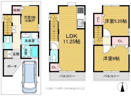 階数 区分 広さ 1F S 3.0帖 2F LDK 11.3帖 3F 洋 6.0帖 3F 洋 5.3帖 - 駐車場