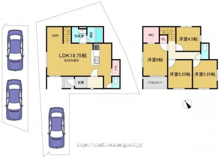 階数 区分 広さ 1F LDK 18.8帖 2F 洋 6.0帖 2F 洋 5.3帖 2F 洋 5.3帖 2F 洋 4.5帖 - 駐車場