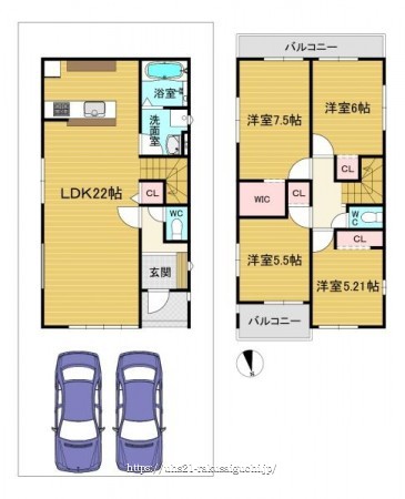 階数 区分 広さ 1F LDK 22.0帖 2F 洋 6.0帖 2F 洋 7.5帖 2F 洋 5.5帖 2F 洋 5.2帖 - 駐車場