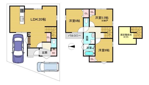 階数 区分 広さ 1F LDK 20.0帖 2F 洋 6.0帖 2F 洋 6.0帖 2F S 5.5帖 - 駐車場