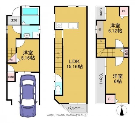 (1F;19.55平米、2F:30.23平米、3F:24.9平米)