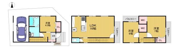 階数 区分 広さ 1F 洋 4.5帖 2F LDK 16.0帖 3F 洋 7.0帖 3F 洋 6.0帖 - 駐車場