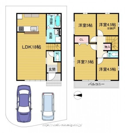階数 区分 広さ 1F LDK 18.0帖 2F 洋 7.5帖 2F 洋 5.0帖 2F 洋 4.5帖 2F 洋 4.5帖 - 駐車場