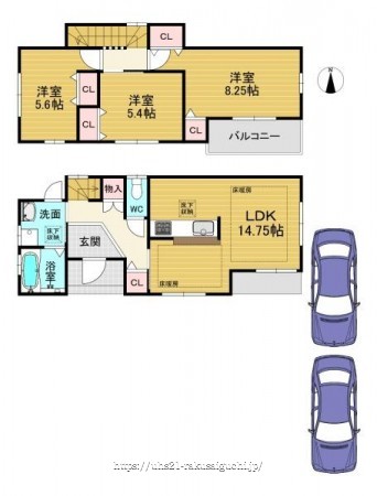 階数 区分 広さ 1F LDK 14.8帖 2F 洋 8.2帖 2F 洋 5.6帖 2F 洋 5.2帖 - 駐車場
