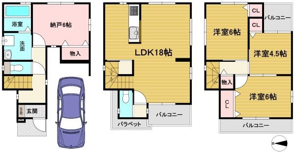 階数 区分 広さ 1F S 6.0帖 2F LDK 18.0帖 3F 洋 6.0帖 3F 洋 6.0帖 3F 洋 4.5帖 - 駐車場