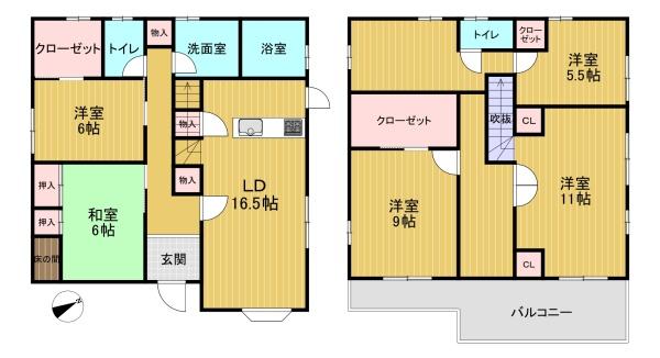 階数 区分 広さ 1F LD 16.5帖 1F 洋 6.0帖 1F 和 6.0帖 2F 洋 11.0帖 2F 洋 9.0帖 1F 洋 5.5帖 - 駐車場