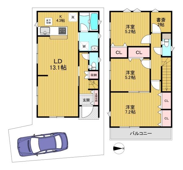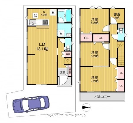 階数 区分 広さ 1F LDK 17.4帖 2F 洋 7.2帖 2F 洋 5.2帖 2F 洋 5.2帖 - 駐車場