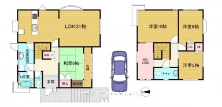 階数 区分 広さ 1F LDK 21.0帖 1F 和 6.0帖 2F 洋 10.0帖 2F 和 6.0帖 2F 洋 5.0帖 2F S 4.5帖 - 駐車場