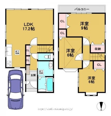 階数 区分 広さ 1F LDK 17.2帖 2F 洋 9.0帖 2F 洋 6.0帖 2F 洋 6.0帖 - 駐車場