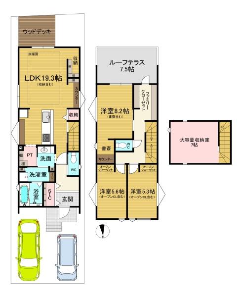 階数 区分 広さ 1F LDK 19.3帖 2F 洋 8.2帖 2F 洋 5.6帖 2F 洋 5.6帖 - 駐車場