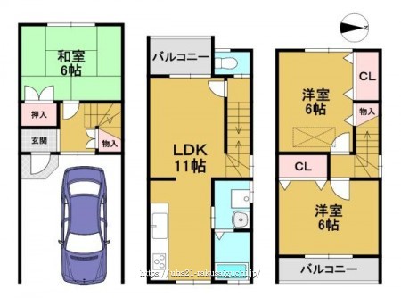階数 区分 広さ 1F 和 6.0帖 2F LDK 11.0帖 3F 洋 6.0帖 3F 洋 6.0帖 - 駐車場