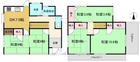 階数 区分 広さ 1F DK 7.5帖 1F 和 6.0帖 1F 和 6.0帖 2F 和 10.8帖 2F 和 6.0帖 2F 和 3.8帖 2F 和 3.8帖 - 駐車場