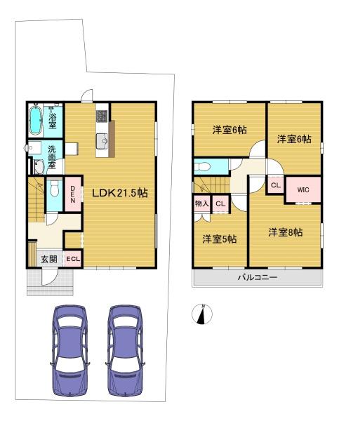 階数 区分 広さ 1F LDK 21.5帖 2F 洋 8.0帖 2F 洋 6.0帖 2F 洋 6.0帖 2F 洋 5.0帖 - 駐車場