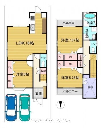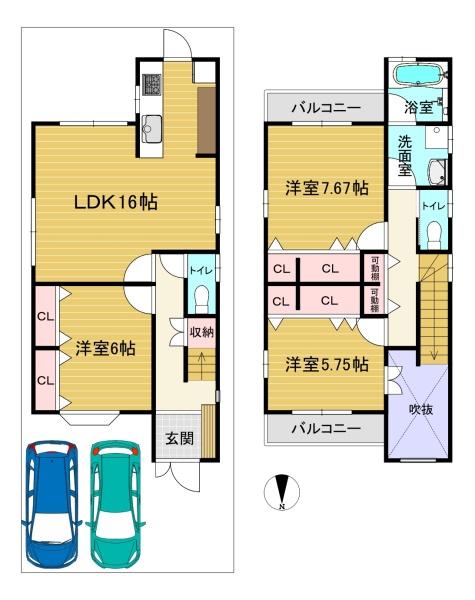 階数 区分 広さ 1F LDK 16.0帖 1F 洋 6.0帖 2F 洋 7.7帖 2F 洋 5.8帖 - 駐車場