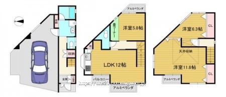 階数 区分 広さ 2F LDK 12.0帖 2F 洋 5.8帖 3F 洋 11.8帖 3F 洋 6.3帖 - 駐車場