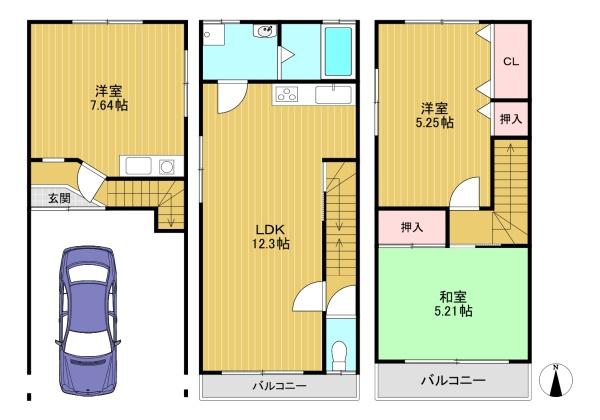階数 区分 広さ 1F 洋 7.6帖 2F LDK 12.3帖 3F 洋 5.3帖 3F 和 5.2帖 - 駐車場