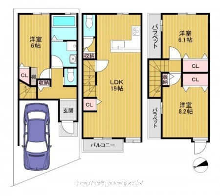延床面積:92.85平米(1F:26.12平米、2F:36.17平米、3F:30.56平米)
