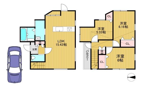 階数 区分 広さ 1F LDK 15.4帖 2F 洋 6.2帖 2F 洋 6.0帖 2F 洋 5.3帖 - 駐車場