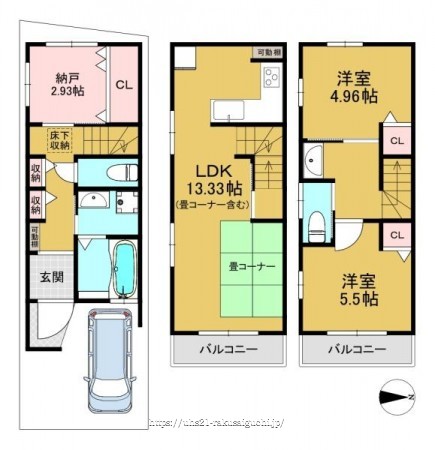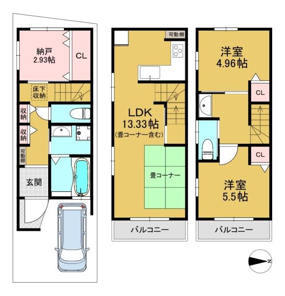 階数 区分 広さ 1F S 2.9帖 2F LDK 13.3帖 3F 洋 5.5帖 3F 洋 5.0帖 - 駐車場